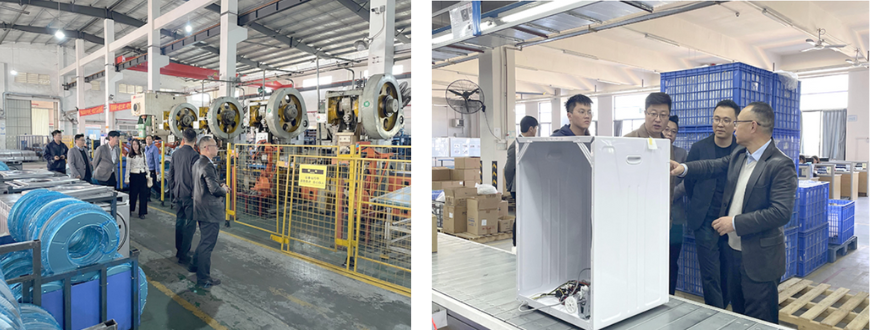 Then the leaders led the customers to the injection molding, stamping, spraying and assembly workshops to see the equipment operation, robot work, box spraying, dryer assembly, dryer testing process, etc. The customers visited carefully and learned about the production of tumble dryers in the factory. Mr. Gao, general manager of Jinhuan Electrical, patiently explained the details of product production and answered customers' questions.